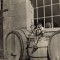 Lydia und Heinrich Hofmann auf einen Holzfass vor der Büttnerwerkstatt Anfang der 1960 Jahre.
